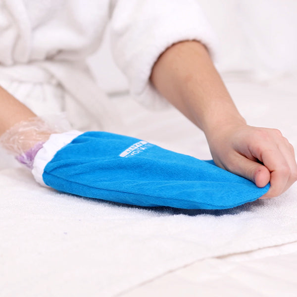 Let your hand sit in the air for a few seconds after each dip. Cover your hands in our New Road Beauty terry-cloth mitts to lock in the wax for at least 10 minutes.